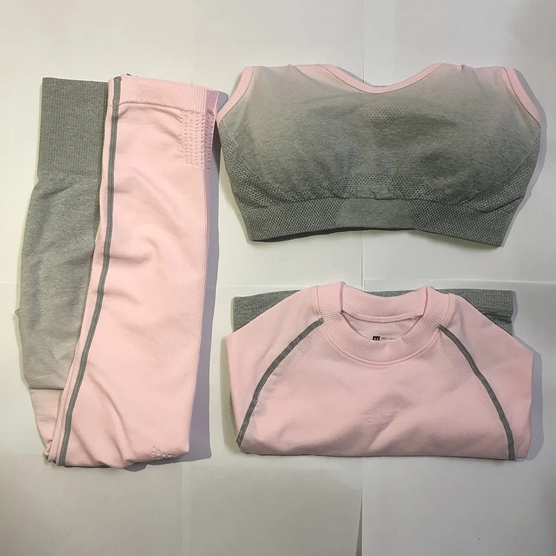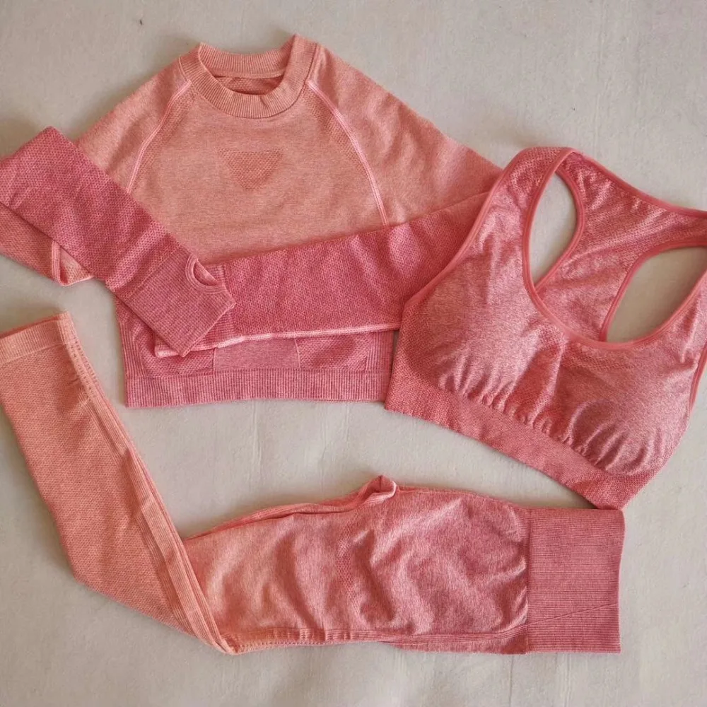 Ombre Seamless Leggings+Sports Bra+Long Sleeve Crop Top 3Pcs Yoga Set Women Running Gym Clothing Hi only US $29.09